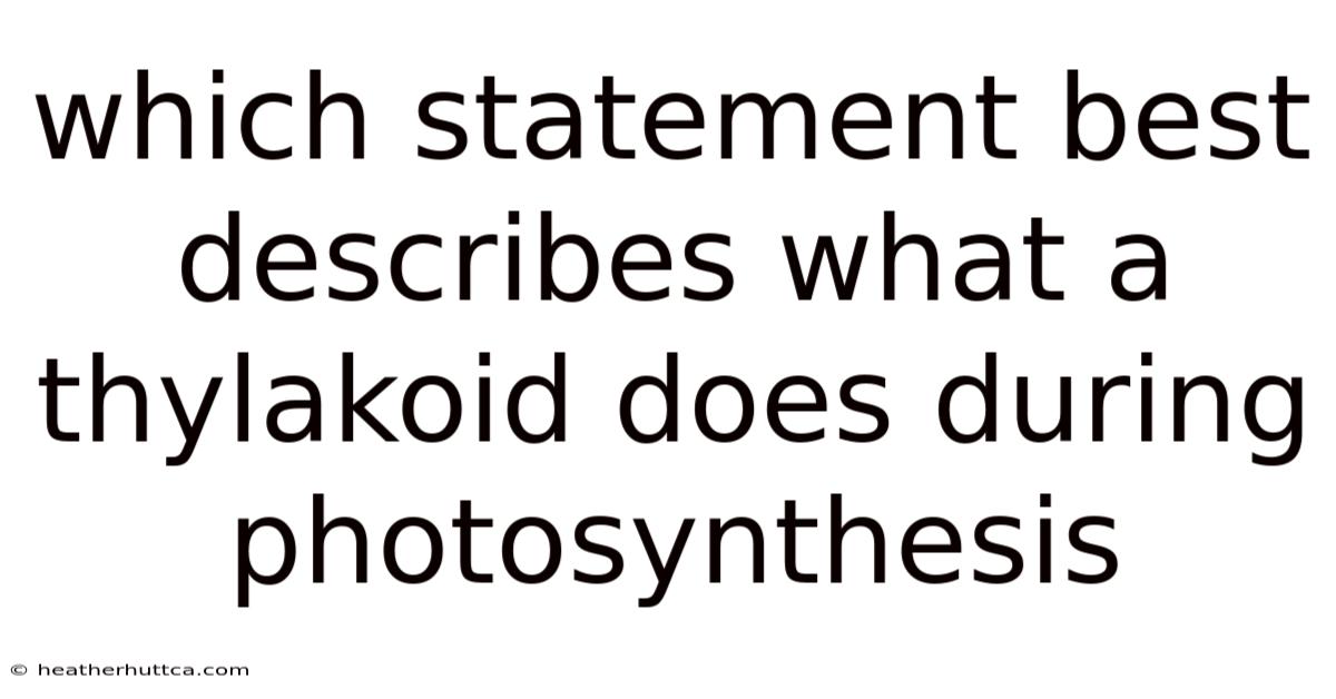 Photosynthesis is the process by which green plants, algae, and certain bacteria convert light energy into chemical energy stored in glucose. Central to this conversion are the thylakoid membranes of chloroplasts, where photons are captured and transformed into ATP and NADPH. That said, when educators ask which statement best describes what a thylakoid does during photosynthesis, they are looking for a concise description that highlights the role of these membranes in light harvesting, water splitting, and energy carrier production. The correct answer typically emphasizes that thylakoids provide the site for the light‑dependent reactions, where photons drive the synthesis of ATP and NADPH while oxygen is released as a by‑product Not complicated — just consistent..